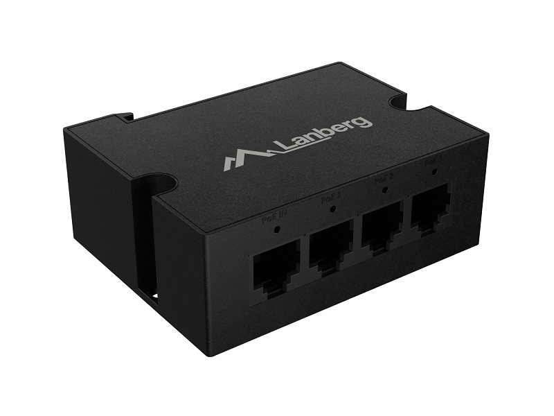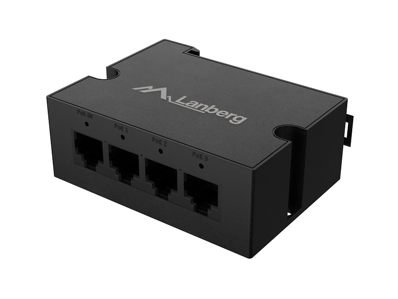 W ofercie Lanberg dostępne są 2 switche extender PoE w formie kompaktowego modułu DIN: oba mają 4 porty w układzie 1x wejście PoE (PoE IN) + 3 porty wyjściowe (PoE OUT). Różnią się klasą PoE i przepustowością: