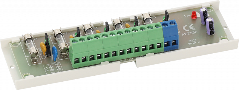 Posiada wejście IN do podłączenia zasilania oraz pięć niezależnie zabezpieczonych wyjść zasilania AUX1÷AUX5. Każde wyjście AUX wyposażone jest w zabezpieczenie przeciwzwarciowe (SCP), w postaci